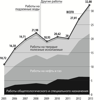 Затраты внебюджетных источников на работы по воспроизводству минерально-сырьевой базы в 2005-2013 годах на порядок превысили расходы федерального бюджета, составив 1 575,2 млрд руб., из них 85% было направлено на восполнение запасов углеводородного сырья. За 2013 год по ориентировочной оценке недропользователями на геологоразведочные работы было израсходовано 307,4 млрд рублей.