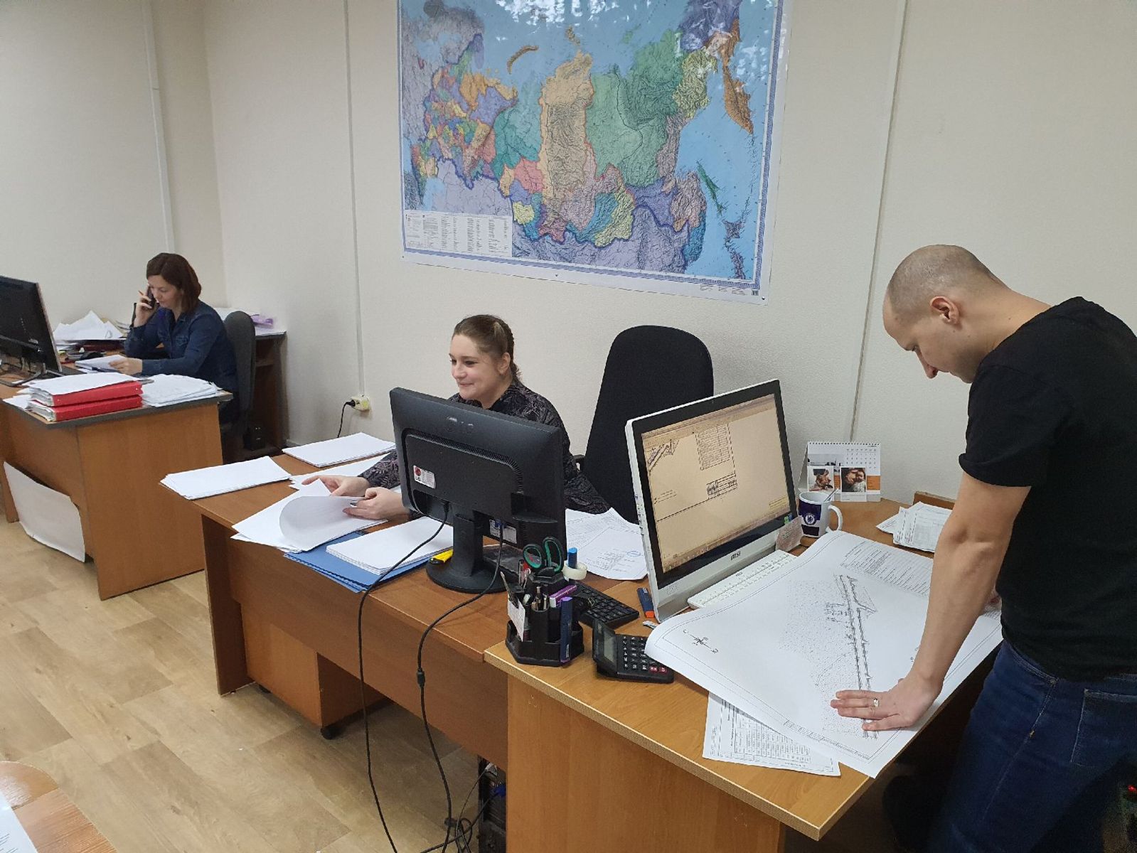 Производственная цепочка на предприятии отлажена до мелочей. Получение технического задания, топографическая съёмка, камеральная обработка, выполнение топографического плана, бурение скважин, исследование добытого грунта в лаборатории, определение места для трассы, подготовка отчёта, готовый проект… Причём все работы специалисты ведут параллельно (к тому же сразу над несколькими проектами), поскольку одно из главных требований к коллективу — выполнение заказа качественно и строго в намеченный срок. И, нужно признать, сбоев в производственном механизме практически никогда не бывает.