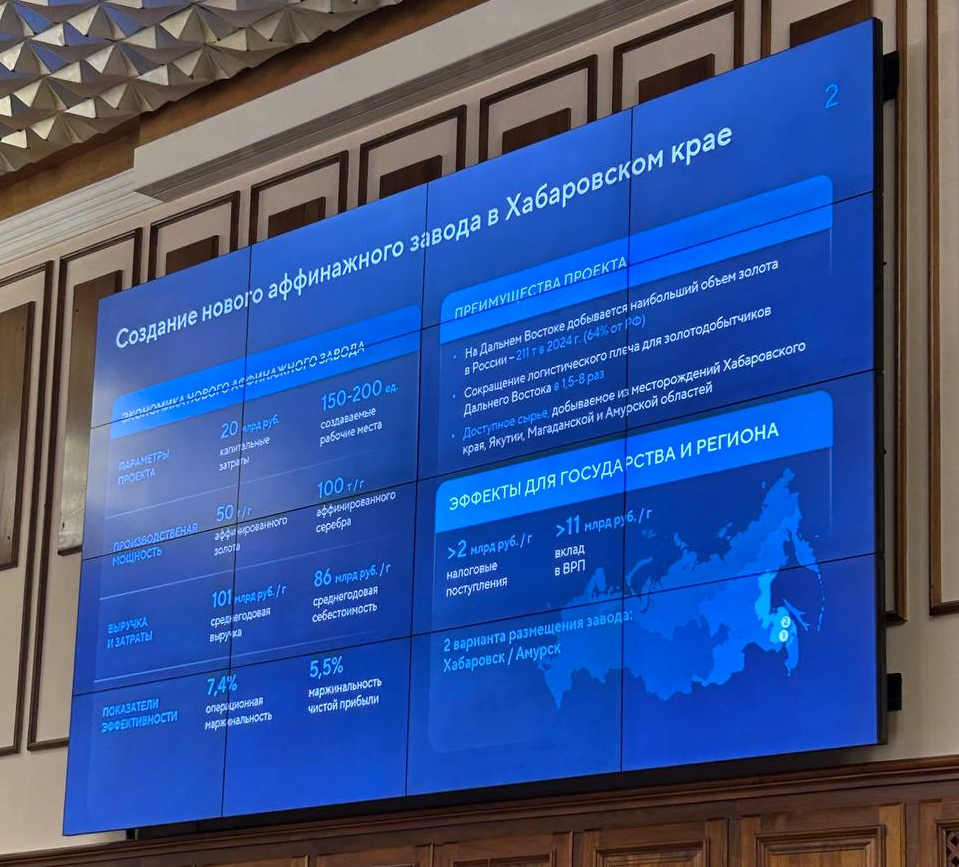 Для размещения завода рассматриваются площадки в Амурске и Хабаровске. Согласно презентации, проектная мощность завода составит 50 тонн аффинированного золота и 100 аффинированного серебра в год. Ежегодные налоговые поступления составят 2 млрд рублей.